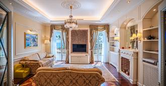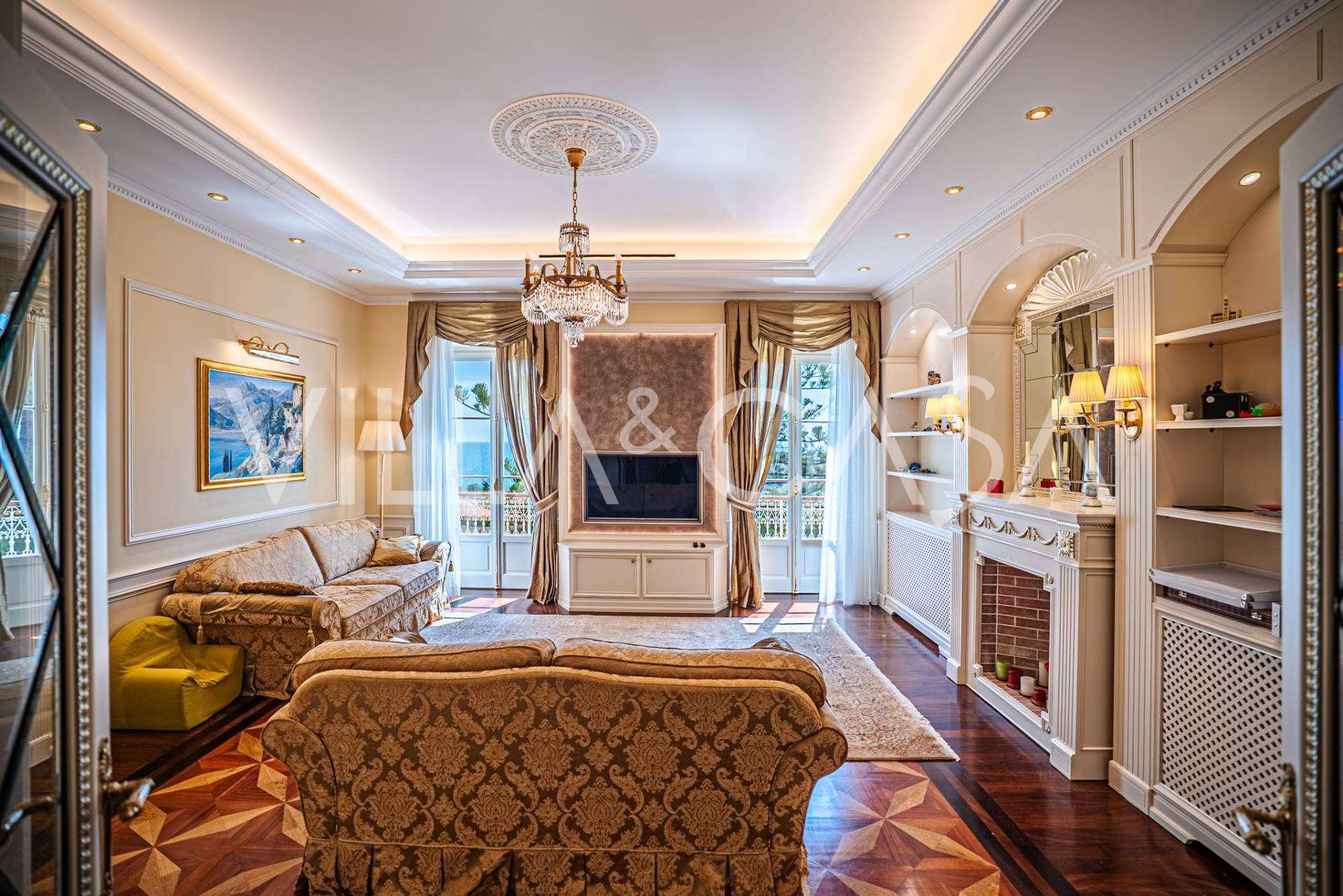 公寓面积为196平方米,占据整个二楼,超越了标准尺寸,以建筑的精致和奢华的空间著称。大堂以天然大理石和独特的装饰面板装饰,优雅地分隔了私人和会客区。从主走廊的彩色玻璃门通向优雅的客厅,作为家的核心,充满光线和魅力,并通向可观赏无边大海和美丽日落的全景露台。