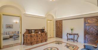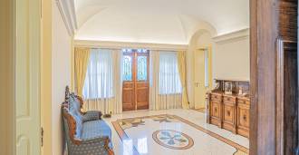 一楼(起居区):主入口通向优雅的大理石椭圆楼梯大厅。宽敞的客厅装饰有灰泥和拱形天花板,可通向南侧露台和花园。旁边是精致的带壁炉的客厅、餐厅、带储藏室的厨房和带大理石壁炉的图书馆。地板装饰有威尼斯马赛克。