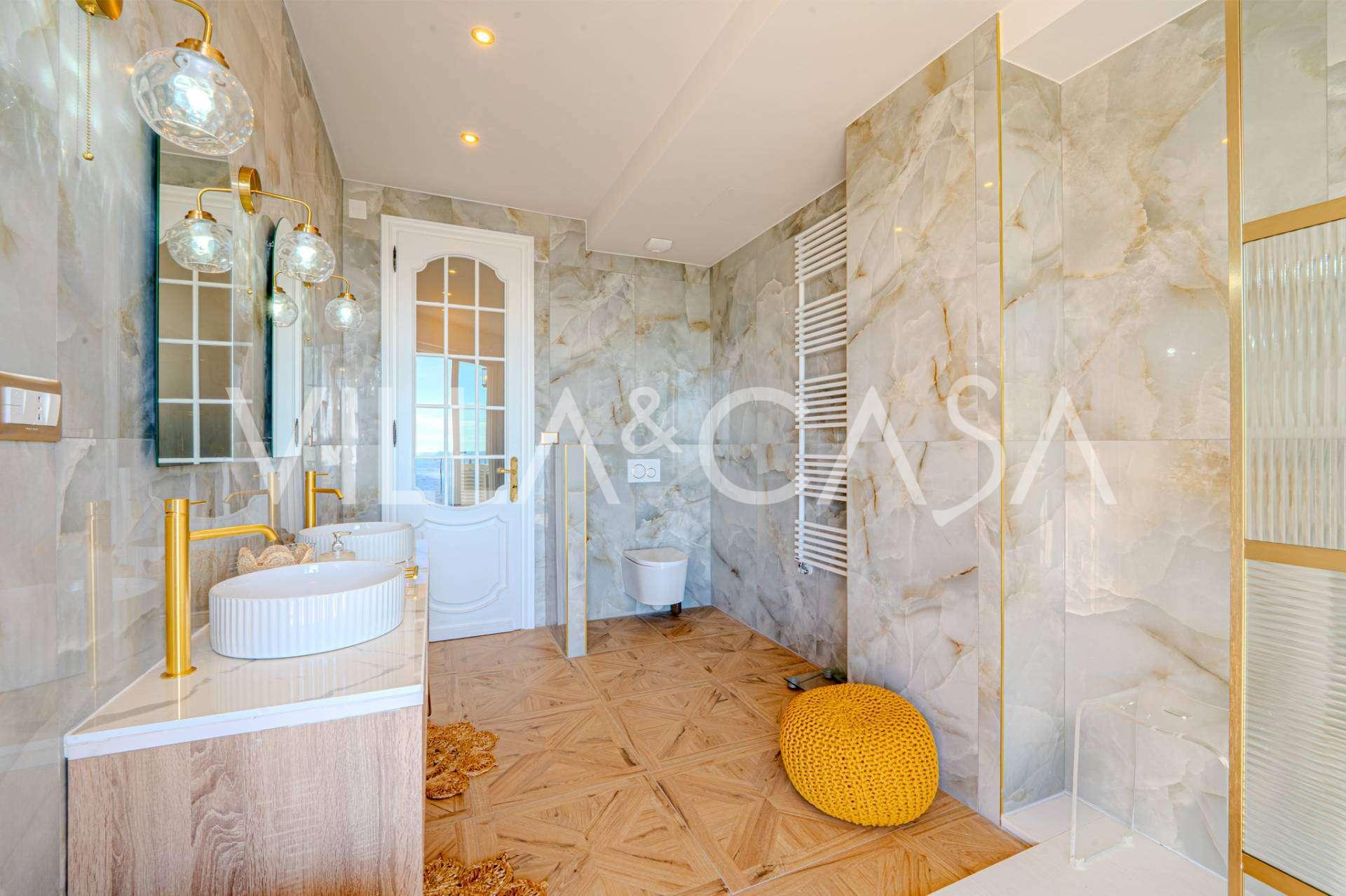 布局包括三间卧室,其中两间直接通向海景阳台,此外还有三间采用高质量材料装饰的浴室。