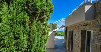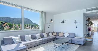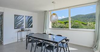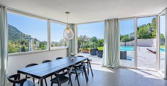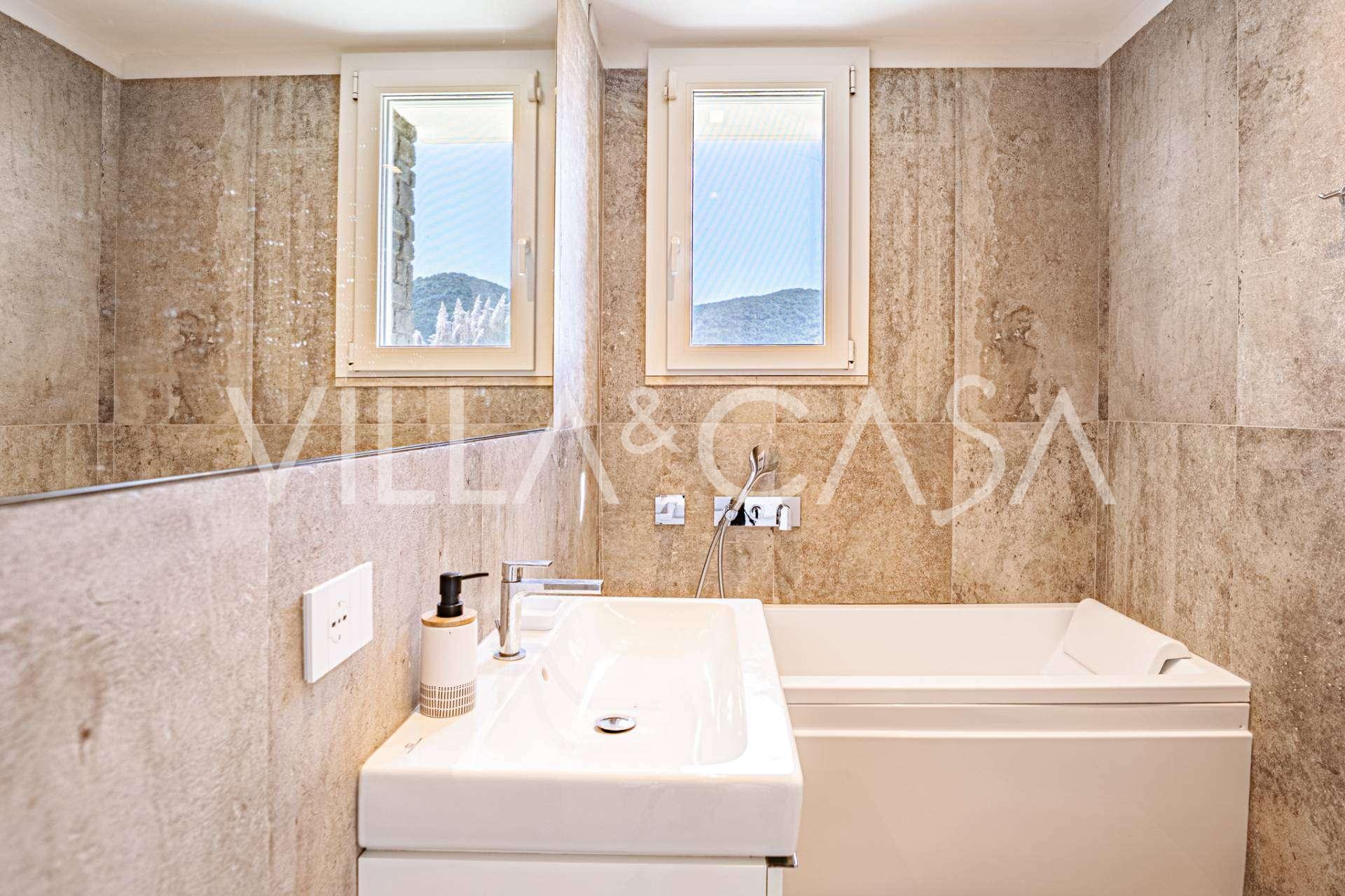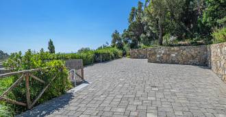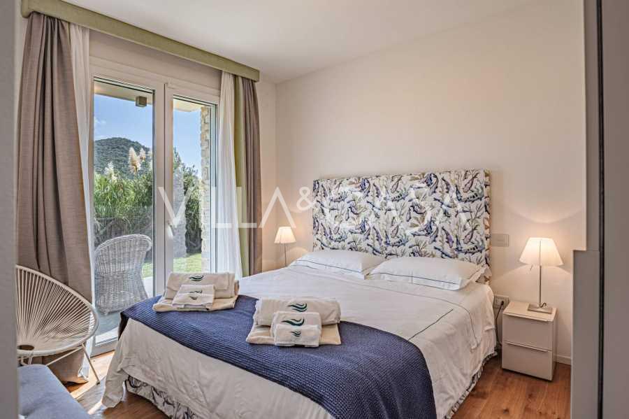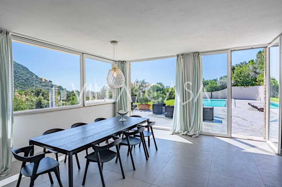 石材和灰泥外墙与地中海景观和谐融合。明亮的客厅设有大窗户和充足的阳光,流畅地连接到俯瞰内院的厨房和餐厅。卧室区包括四间双人卧室和一间单人卧室,每间卧室都有独立的浴室。